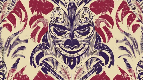 © Diandra, Fototapeta premium Intricate symmetrical mask design with floral elements, beige and burgundy palette.