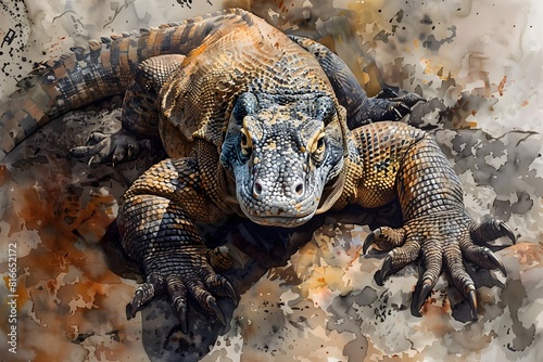 Obraz premium Intricate Textures of a Basking Komodo Dragon in Watercolor