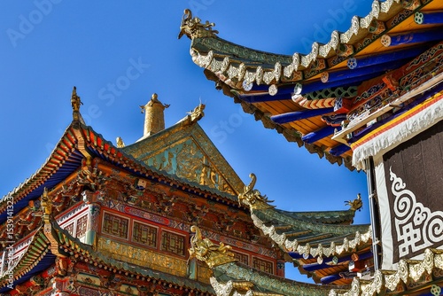 © Tenzin & Li, Fototapeta premium Intricate Tibetan architecture details of Taktsang Lhamo Monastery (Langmusi), a sacred Buddhist site in the Amdo region, showcasing vibrant ornamentation and traditional roof design.