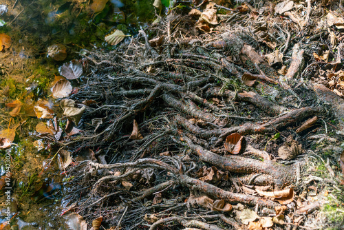 © bykot, Fototapeta premium Intricate tree roots and fallen leaves by a tranquil forest stream