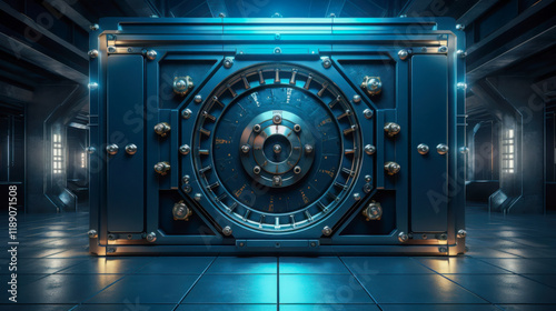 Fototapeta premium Intricate vault door illuminated by blue light in modern underground facility...
