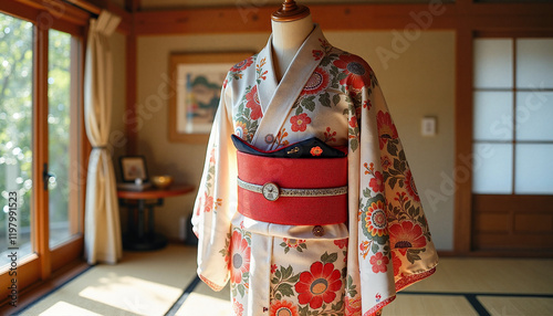 © labir, Naklejka premium Intricate wedding kimono displayed in tatami room, cultural elegance