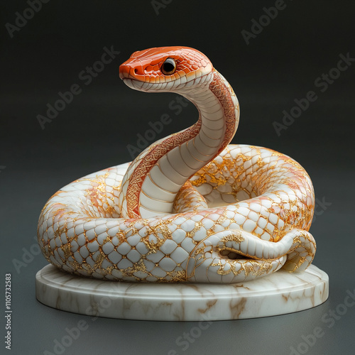 Fototapeta premium Intricate white and orange snake sculpture resting on a marble base in a...