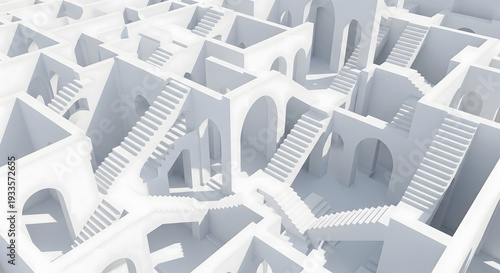 Obraz premium Intricate white architectural labyrinth of interconnected stairs and arches,...
