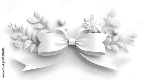 © MindVerse, Naklejka premium Intricate White Floral and Ribbon Bow Design for Decorative Elements, 3d ribbons and flowers artwork