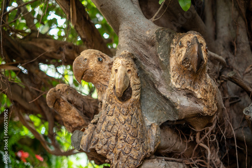 © Kepler, Obraz premium Intricate wood carving of parrot faces blending into tree trunk in vibrant forest