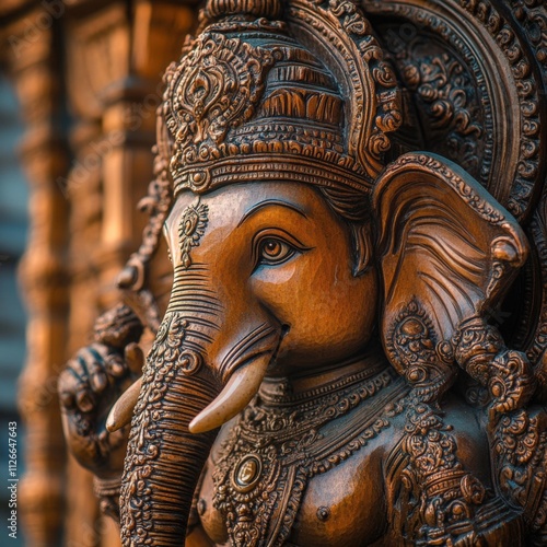 © Aashutosh Pandit, Obraz premium intricate wooden carving of a deity with elephant features