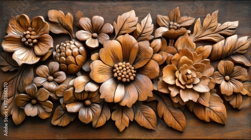 Fototapeta premium Intricate wooden floral carving showcasing nature's beauty in a warm,...