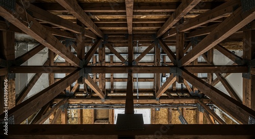 Obraz premium Intricate wooden roof structure with exposed beams and trusses in an old building attic showing architectural framework and construction details