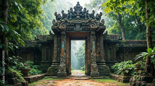 © NoblePix, Obraz premium Intricately Carved Ancient Southeast Asian Temple Gate Enclosed by Lush Jungle