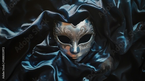 Naklejka premium Intricately designed carnival mask resting on luxurious black silk fabric,...