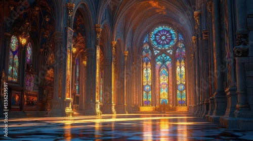 Fototapeta premium Intricately designed cathedral interior with radiant stained glass windows