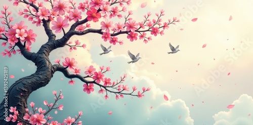 © Ningjing, Fototapeta premium Intricately designed floral tree branches featuring various birds in flight amidst a backdrop of soft pastel hues, motif, tree