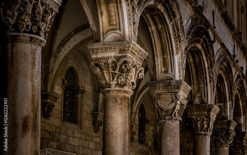 © Colin, Fototapeta premium Intricately Designed Stone Column and Archway Structure in Historic Building Interior