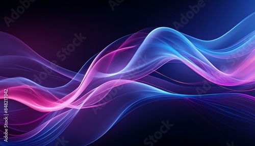 © Studio NJ, Naklejka premium Intricately flowing pink blue purple waves on black background. Smooth curvy shape fluid background. Transparent smooth wave. Colored smoke whiffs and swirls