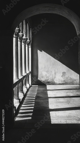 Fototapeta premium Intriguing archway, sunlight casts dramatic shadows on ancient hallway