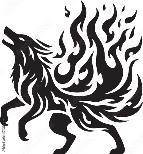 Fototapeta premium Intriguing Black Silhouette of a Howling Wolf with Fiery Flames, Artistic Design
