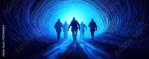 © Kanin, Fototapeta premium Investigative team infiltrating a hidden lair, moving stealthily with tension and dramatic lighting, illustration, breaking into a crucial hideout