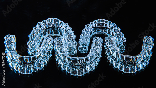 Obraz premium Invisible dental teeth brackets tooth aligners on black background. Plastic...