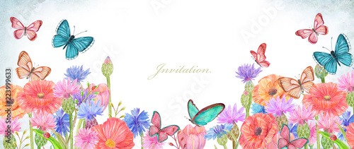 © Aloksa, Fototapeta premium invitation banner with lovely summer flowers. watercolor painting