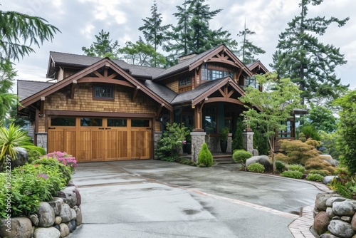 Fototapeta premium Inviting Craftsman Home with Stone Trim, Garage and Driveway: Exterior View of Northwest Style House