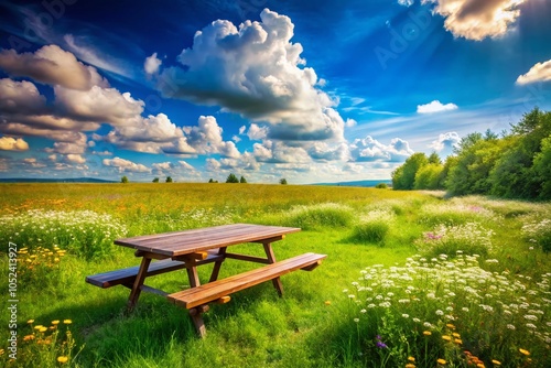 © Arnada, Obraz premium Inviting Empty Picnic Table in Peaceful Meadow for Relaxation and Outdoor Enjoyment
