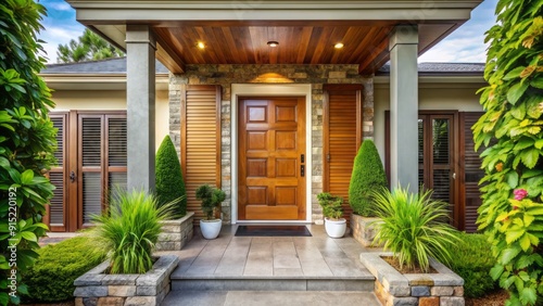 © Wanlop, Obraz premium Inviting entrance of a modern home with a stylish wooden door, contrasting shutters, and lush greenery surrounding the porch and walkway leading inside.