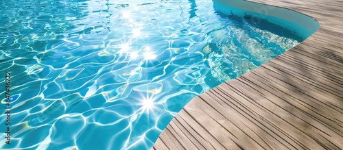Obraz premium Inviting fiberglass swimming pool entrance step with crystal-clear blue water on a sunny summer day in a resort spa area. Teak or larch board deck adds a touch of elegance.