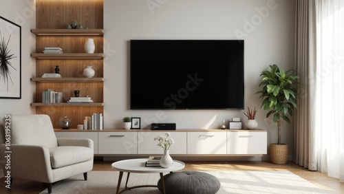 Fototapeta premium Inviting Media Room with Organized Decor and Ample Copyspace