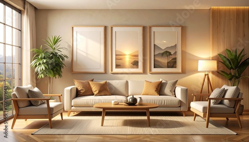 Fototapeta premium Inviting modern living room interior design with comfortable furniture, natural light filtering through large windows, and serene framed nature artwork creating a peaceful home atmosphere