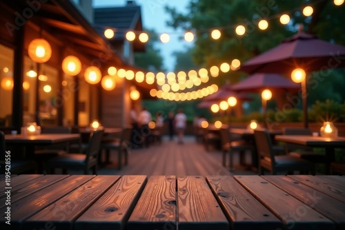 © SuriyaPhoto, Obraz premium Inviting outdoor dining area with warm ambient lights and wooden tables at twilight.