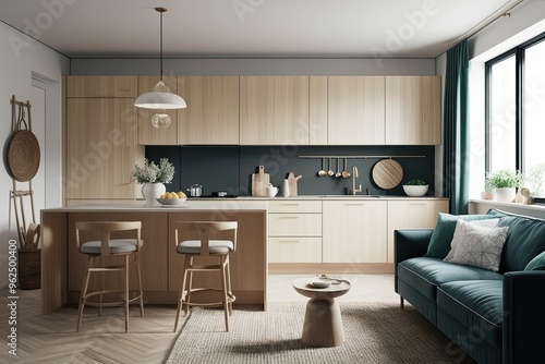 Fototapeta premium Inviting Scandinavian Home Interior with Modern Kitchen Scene in 3D Illustration