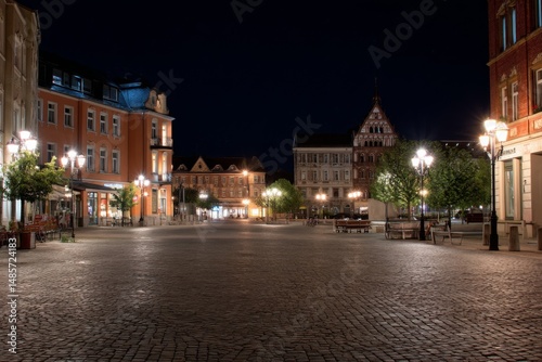 © Sasha, Fototapeta premium Inviting Town Square at Night with Cobblestone Paving, Illuminated by Streetlights and Historic Building Facades