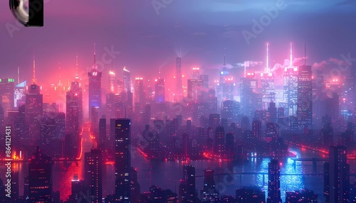 Fototapeta premium IoT Cityscape, view of US metropolises with skyscrapers adorned with glowing...