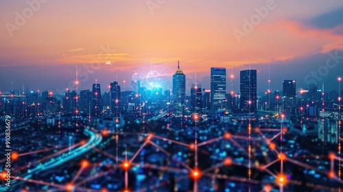 Fototapeta premium IoT networks optimizing urban infrastructure, selective focus, smart city solutions, vibrant, overlay, urban skyline backdrop