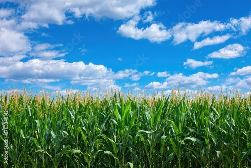 © Vlad, Fototapeta premium Iowa Corn Field under Blue Sky with White Clouds. Summer Agricultural Scene with Green Stalks and Cobs