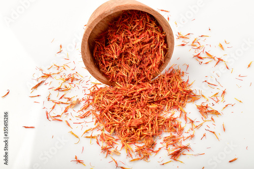 © dharmapocan, Fototapeta premium Iranian red saffron spice in wooden bowl isolated on white background