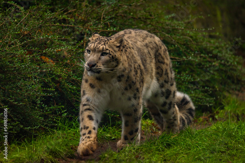 Fototapeta premium Irbis animal with hairy body on green grass in autumn day