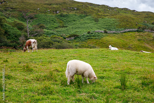 Fototapeta premium Ireland landscape. Magical Irish hills. Green island with sheep and cows on...