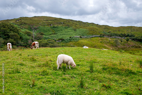 Fototapeta premium Ireland landscape. Magical Irish hills. Green island with sheep and cows on...