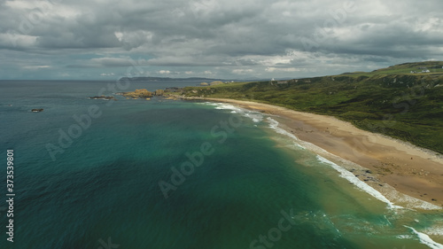 © Goinyk, Fototapeta premium Ireland sand beach aerial view: ocean waves, sandy coastline, white shore with greenery meadows. Epic Irish landscape with gray clouds on sky in summer day cinematic shot