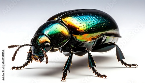 © Hardi, Naklejka premium Iridescent beetle, close-up view, showcasing intricate details and vibrant colors against a simple white background