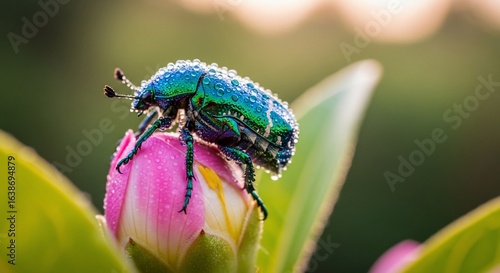 © Miya, Fototapeta premium Iridescent Beetle Covered in Dew Drops on a Pink Flower Bud