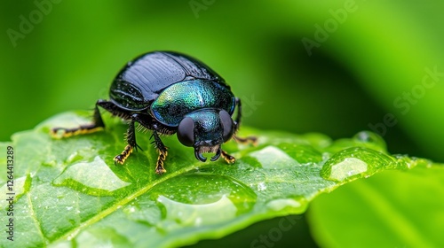 © Patchayanit , Fototapeta premium Iridescent Beetle on a Vibrant Green Leaf with Water Droplets in a Macro View