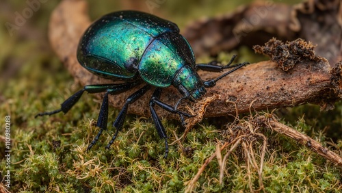 Fototapeta premium Iridescent beetle on bark with metallic sheen