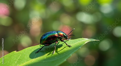 Fototapeta premium Iridescent Beetle on Green Leaf in Sunlight