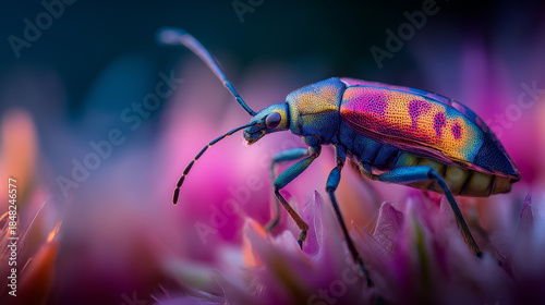 Fototapeta premium Iridescent Beetle With Colorful Pixels On Pink Flower Macro Photography