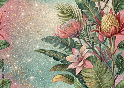 © DigitalArt Max, Naklejka premium Iridescent Botanical Glitter Art: Shimmering Flower Illustrations, Gradient Background, Botanical Prints, Shiny Plants