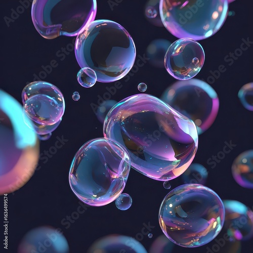 © Inayah, Naklejka premium Iridescent Bubbles Float in Dark Space, Abstract Background, Design Element