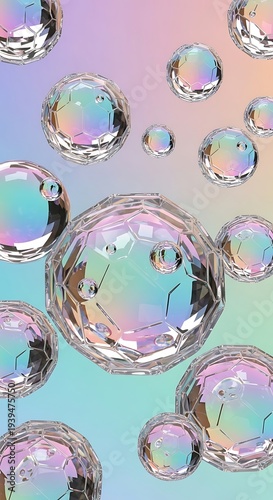 © Razzaque, Fototapeta premium Iridescent bubbles float in pastel rainbow gradient background